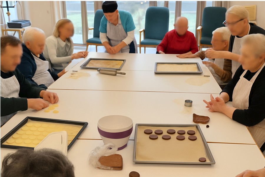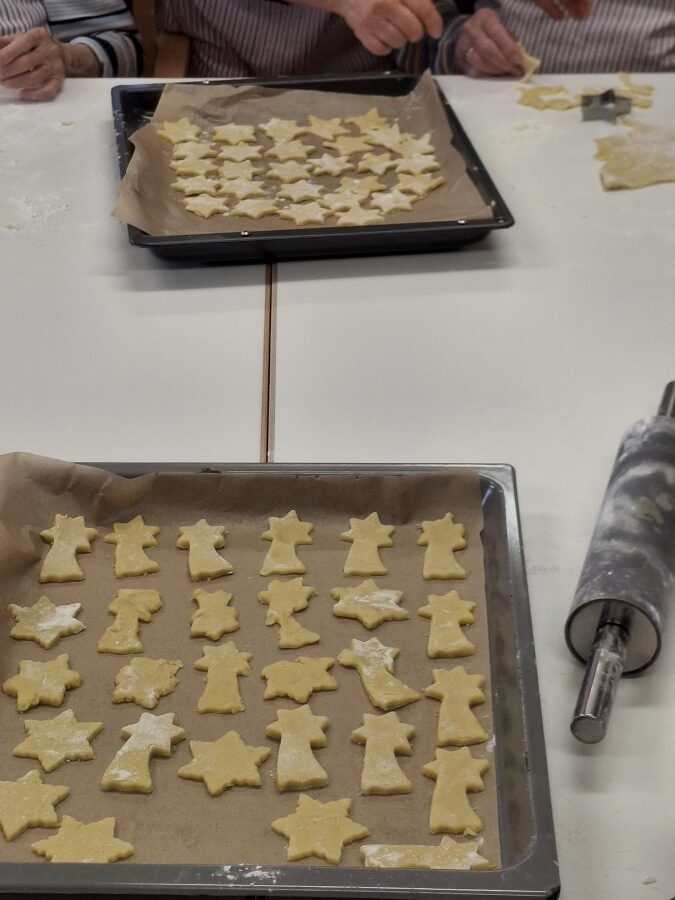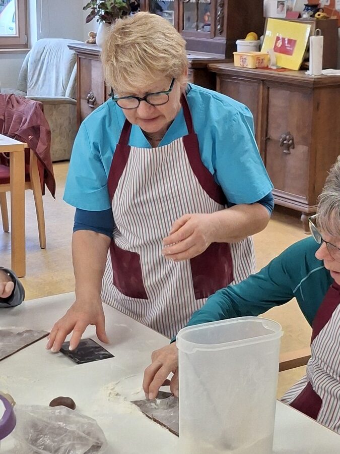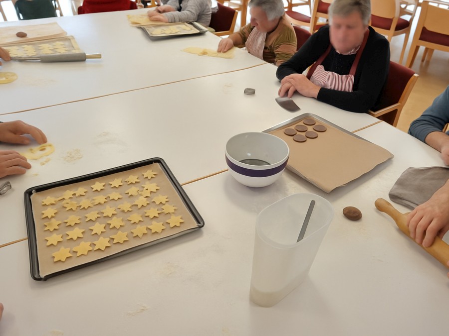 Als Aktivierung in der Vorweihnachtszeit stand „Weihnachtsplätzchen“ auf dem Programm. Zusammen mit unseren Mitarbeiterinnen Silvia und Ghazala legten die Tagesgäste los wie die Feuerwehr, rollten den Teig aus, stachen schönen Formen aus und bepinselten die Teile nach belieben. Danach wurde gebacken und natürlich am Nachmittag mit einem Kaffee genascht. Ein Spaß für alle Beteiligten.